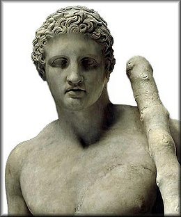 of Perseus. Say what? Hera was having none of this! First she made Zeus swear an unbreakable oath that any prince born before nightfall to the House of Perseus should be High King. "No problemo", said Zeus. Hera then raced to Mycenae and hastened the birth pangs of Nicippe, wife of King Sthenelus, who was seven months pregnant. Next Hera hurried to Thebes and squatted cross-legged at Alcmene's door. All that was missing was the voodoo doll. With her clothing tied into knots, and her fingers locked together, the squatting Hera delayed the birth of Hercules until Nicippe had delivered her premature son, Eurystheus. Don't try this at home, kids, these are trained professionals. Shortly thereafter my nephew Herc was born, followed an hour later by his twin brother Iphecles, who was Amphytrion's son and the younger by a night. Some say that Zeus divinely illuminated the birth chamber, but at the most crucial moment was distracted. I'm here to tell you that it wasn't a pretty sight when Hera returned to Olympus and haughtily boasted how she kept Eileithyia, goddess of childbirth, from visiting Alcmene first. According to Zeus' own oath, Eurystheus would be the High King of the House of Perseus, "having been primogenitured," in Hera's words. I've rarely seen my godfather more enraged! I don't know if Zeus was more pissed at once again having being bamboozled by Hera, or because he didn't have a clue in Hades what "primogenitured" meant... He hated when that happened! Yo, Athena, what's "primogen.."...oh, forget it! Seizing his eldest daughter, Ate, whose mindless chattering had blinded him to Hera's deceit, he whirled her by her golden hair and sent her hurtling down to earth. "You'll never set foot again on Olympus, you conniving witch!" he roared at her, as she fell screaming to an earthly exile. Lighten up, Zeus! Why can't you just discipline the poor girl, maybe take away her chariot privileges for a month? She was only acting on her mother's instructions, after all. No need to 'ground' her for life! Hera was experiencing acute deja-vu. Visions of being strung up from the heavens, with heavy anvils tied to her feet, raced through her mind. Turning his livid gaze on her, Zeus barked that he couldn't go back on his oath, but when his boy Hercules successfully performed 10 labors for that "puny punk Eurystheus", he should become a god. "You got a problem with that, darling?" he icily hissed at Hera, readying his thunderbolts in case her response was not to his liking. She reluctantly agreed, which was wise because Zeus had asked the kids to leave the room, always a sign of pending thunderbolt activity. You could set your weather forecast by it. But haughty Hera wasn't going to go quietly. At that moment, she swore to herself that she would make the life of Hercules complete Hades. And, without belaboring the point, boy did she ever! Heracles - "Glory of Hera" indeed! Is that ironic or what? No wonder the hero legally changed his name to Hercules early on in his career. "I've tried hard to like that woman, and I've failed miserably," Herc once told me. "I'll be damned if I honor that wicked step-mother of mine anymore! It's Hercules from here on, unc!" Yes, Hera would prove to be Herc's personal Nemesis, thwarting his every move and making life miserable for the greatest hero who ever lived. The literary gang nearly came to blows over the true origin and identity of Hercules one late night down at Thanasi's Olympus. It was long ago and the memory is foggy, but to the best of my recollection, here's the basic context of the great debate: Diodorus Siculus: "There were three heroes named Heracles: an Egyptian; a Cretan Dactyl; and the son of Alcmene. Anyone who claims otherwise possesses a room temperature IQ. A very cold room." Cicero: "The number was six. Didn't I send you a copy of my latest book, 'On the Nature of the Gods', dear Dio? I must remember to do so!" Varro: "Forty-two! Some drink from the fountain of knowledge but it appears that you two just gargled! There were forty-two Heracles! I can prove it!" Diodorus Siculus: "Varro, you must have got into the gene pool while the lifeguard wasn't watching! There were three Hercs! Vicki, more Ambrosia please, and make Varro's de-caf!" Varro: "Forty-two!" Diodorus Siculus: "Three!" Cicero: "Six!" And so it went for hours, tempers flaring as dueling egos wrestled with the facts. Just as the Dio/Cicero tag team was about to strangle Varro, in stepped Herodotus, the voice of calm and reason. Herodotus: "When I asked for Heracles's original home, the Egyptians referred me to Phoenicia, so I'm partial to Dio's argument." Diodorus Siculus: "Thank you, Hero my man! The Egyptian Heracles, called Som, or Chon, lived ten thousand years before the Trojan War, and his Greek namesake inherited his exploits. I swear, these clowns are so dense, light bends around them, Herodotus!" Varro: "Who you calling a clown, fool? Wan'na step outside?" Oh my...just goes to show what happens when you read too many books, I guess. Good thing Hesiod and Homer weren't there that night, or there would have been a fistfight for sure. March Myth of the Month continues here: Hercules Chapter Three |